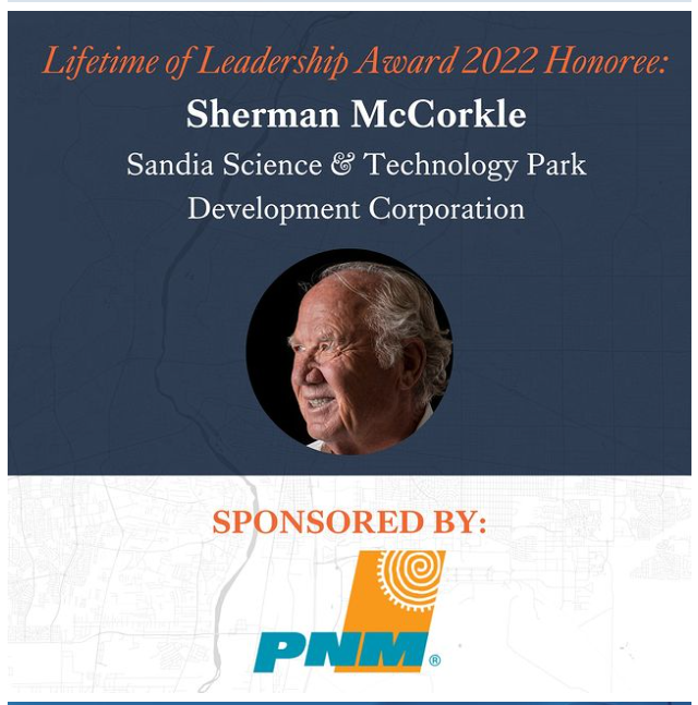 Few New Mexicans can claim the number of achievements as the man whose impact and legacy have enhanced more lives and businesses in New Mexico by contributing greatly to job creation and economic development than Sherman McCorkle. Without him, major initiatives and infrastructure development that drive our economy today such as the CNM workforce training center, the New Mexico Manufacturing Extension Partnership (NMMEP), Technology Ventures Corporation to accelerate technology startups in partnership with Sandia National Laboratories, and the protection in 1995 of Kirtland Air Force Base from Base Realignment and Closure (BRAC) — saving tens of thousands of military jobs and thousands of aligned contractor jobs in New Mexico — would not have been possible.